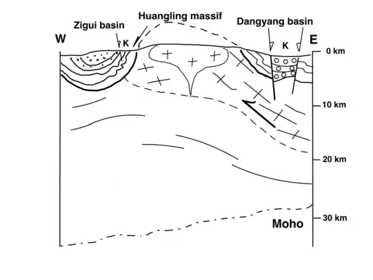 Huangling massif exhibits an asymmetric dome shape striking to the north-south orientation. The north and south sides of the Huangling Anticline dip gently while the basins on the eastern flank and western flank of the dome have different dip angles. Zigui Basin, which is to the west of the Huangling Anticline, dips moderately at 40° westward. Dangyang Basin, which is to the east of the Huangling Anticline, in contrast, dips gently at 15° eastward.[3] The reason of asymmetric folding will be discussed in the later part. Besides, a large number of recumbent folds trending N-S can be found on Zigui Basin and Dangyang Basin. They extrude to the west and to the east, respectively.[3] During Late Jurassic to Early Cretaceous, there was a compressive environment causing the uplift of Huangling massif and folding in the Huangling Anticline. The exhumation of Huangling massif and formation of recumbent folds, plus vertical crustal shortening, occurred at the same time. After the uplift of Huangling dome during Triassic, the environment changed to extensional. Brittle deformation forming rifts and grabens followed. High-angle normal faulting can be found in Yuanan Graben and Jingmen Graben on the east side of the Huangling Anticline.[3]