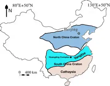 The Huangling Anticline or Complex represents a group of rock units that appear in the middle of the Yangtze Block in South China,[1] distributed across Yixingshan, Zigui, Huangling, and Yichang counties.[2] The group of rock involves nonconformity that sedimentary rocks overlie the metamorphic basement.[3] It is a 73-km long, asymmetrical dome-shaped anticline with axial plane orientating in the north-south direction. It has a steeper west flank and a gentler east flank.[3] Basically, there are three tectonic units from the anticline core to the rim, including Archean to Paleoproterozoic metamorphic basement, Neoproterozoic to Jurassic sedimentary rocks, and Cretaceous fluvial deposit sedimentary cover.[2] The northern part of the core is mainly tonalite-trondhjemite-gneiss (TTG) and Cretaceous sedimentary rock called the Archean Kongling Complex.[4] The middle of the core is mainly the Neoproterozoic granitoid. The southern part of the core is the Neoproterozoic potassium granite.[5] Two basins are situated on the western and eastern flanks of the core, respectively, including the Zigui basin and Dangyang basin. Both basins are synforms while Zigui basin has a larger extent of folding. Yuanan Graben and Jingmen Graben are found within the Dangyang Basin area.[3] The Huangling Anticline is an important area that helps unravel the tectonic history of the South China Craton because it has well-exposed layers of rock units from Archean basement rock to Cretaceous sedimentary rock cover due to the erosion of the anticline.[6]