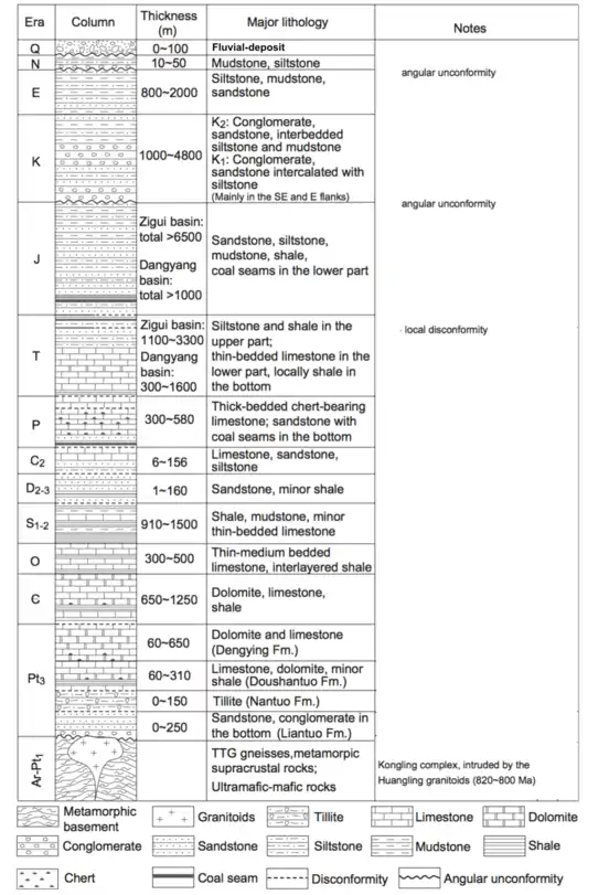 The geology time range of Huangling Anticline is from the Archean to Mesozoic Cretaceous. The overlying rocks are sedimentary rock from the Neoproterozoic to Cretaceous.[3] Here, three lithological units will be introduced.