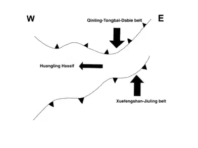 In the Early Mesozoic, as the South China Craton subducted beneath the North China Craton, the accumulation of continental material facilitated orogenic belt forming at the collision area.[25] Examples include the Qinling-Tongbai-Dabie belt, Longmenshan thrust belt, and Indochina belt. The Xuefengshan-Jiuling belt lying in the middle of the South China Craton also formed due to the compressive force. Huangling massif was quite stable because its location in the middle of the South China Craton was shielded from the uplift orogenic events at the rim.[3]