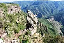 The Peña del Aire is an enormous basalt rock that juts off the side of a canyon just north of the Santa María Regla Hacienda. Located 800 meters above the canyon floor, upon first glance, it appears suspended in the air, giving it its name. In this canyon flows a river arriving from Tulancingo and leading to the San Sebastian Canyon. Near this landmark are areas dedicated to rappelling, mountain climbing and hiking.[5][10]
