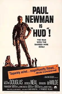 Hud was acclaimed during its premiere at the 24th Venice International Film Festival.[29] After its general release on May 29, 1963, the film grossed $10 million at the domestic box office,[2] earning $5 million in theatrical rentals.[31] It was the 19th-highest-grossing film of the year. Life called Hud an "arresting—almost great—movie", describing Paul Newman's acting as "faultless".[32] An Outlook reviewer wrote that the four main cast members acted "splendidly"; Newman "speaks at times with an unpleasant nasal twang, but is clearly suited to the part." They described Melvyn Douglas' performance as "impeccable", Brandon deWilde's as "[successful] in looking earnest unsure of himself" and praised Patricia Neal's expressiveness.[33] Time called the performances "splendid", and Howe's photography "brings the Texas Panhandle to dusty, sweaty life."[34] The New York Times, in a favorable review, said Ritt's direction had "[a] powerfully realistic style" and called Ravetch and Frank's work "[an] excellent screenplay." The newspaper called Newman's acting "tremendous", Douglas' "magnificent", deWilde's "eloquent of clean, modern youth" and Patricia Neal's "brilliant." The review also praised James Wong Howe's "excellent" camera work and Elmer Bernstein's "poignant" score.[35] Variety called Hud "a near miss"; its screenplay fails to "filter its meaning and theme lucidly through its characters and story", although it called the four leads' performances "excellent."[36]