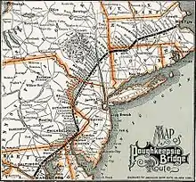 The Hudson Valley Rail Trail is part of the former rail corridor that comprised the Poughkeepsie Bridge Route. It ran east through the hamlet of Highland, in the town of Lloyd, over the Hudson River via the Poughkeepsie Bridge.[2] Highland has historically been Lloyd's largest population center.[3] The corridor was, throughout its history, operated by the Central New England, Philadelphia and Reading,[4] New Haven, Erie, Ontario and Western, Lehigh and New England and Penn Central railroads. Under the ownership of Penn Central, traffic along the bridge route was discouraged in favor of a northern route through Selkirk; the use of newer technology at Selkirk Yard to improve efficiency was cited as the primary reason.[5] At one point, the Poughkeepsie corridor had been the primary thoroughfare for freight being shipped to New England, and the New Haven yard at nearby Maybrook was once "the largest railroad yard east of the Mississippi River". Rail traffic over the Poughkeepsie Bridge stopped entirely after the bridge was damaged in a May 8, 1974 tie fire.[6]