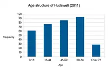 According to the 2011 census, the population of Hudswell is 353; divided between 169 males and 184 females.[10] 17.3% of the population was aged 0 to 17; 24.3% aged 18 to 44; 24.1% aged 45 to 59; The largest age group was between 60 and 74 with 26.3% and 7.9% aged 75 and over.[11]