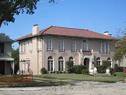 It is a pink stuccoed house built of concrete blocks. According to its NRHP nomination, its architecture "borrows from several