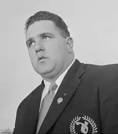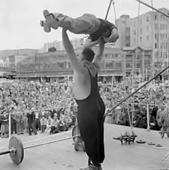 Jones lifting a man at a public event in Wellington in 1959