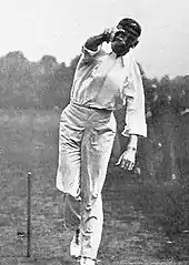 When bowling, Trumble made the most of his height, bringing the ball over the full extent of his right arm.[61] His action was described by his team-mate and bowling partner, Monty Noble, as "sidelong and insinuating, with his neck craned like a gigantic bird".[9] He bowled off spinners with an impeccable length at medium pace and was able to swing the new ball.[60] He had a well-disguised slower ball, hoodwinking batsmen such as Stanley Jackson, who said, "You old devil. You get me caught-and-bowled whenever you like but I'll pick that slow one sooner or later."[9] He preferred English pitches, saying he hardly saw one on which he could not get some turn and the temperate weather allowed him to bowl all day.[9] In Australia, Trumble had to work harder for his wickets on firmer pitches, relying on his change of pace and consistent accuracy; he claimed he could land the ball on a saucer 17 metres (19 yd) away five times out of six.[9] Johnnie Moyes named him as an "immortal of the art" who succeeded by "attacking the batsman's strength".[60] W. G. Grace called him "the best bowler Australia has sent us".[1] While Trumble was able to score 1,183 runs during the 1899 tour of England, the demands of bowling did not allow him to consistently score heavily.[9] His long, prehensile fingers helped him make a reputation as a fine slips fieldsman and he was the first to take 20 catches in an Australian season.[9] English cricketer Johnny Douglas said, "Trumble should not be allowed on the cricket field—his natural place would be up trees in the bush."[9] He practised slip fielding by catching a tennis ball thrown against a brick wall; he believed this practise trained him not to "snatch" at the ball but allow it to fall into his safe hands.[6]
