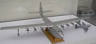 The HK-1 aircraft contract was issued in 1942 as a development contract[9] and called for three aircraft to be constructed in two years for the war effort.[10] Seven configurations were considered, including twin-hull and single-hull designs with combinations of four, six, and eight wing-mounted engines.[11] The final design chosen was a behemoth, eclipsing any large transport then built.[9][12][N 1] It would be built mostly of wood to conserve metal (its elevators and rudder were fabric-covered),[13] and was nicknamed the Spruce Goose (a name Hughes disliked) or the Flying Lumberyard.[14]