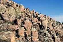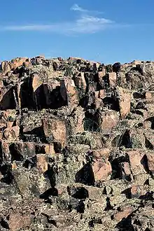Hughes Mountain is a peak in the St. Francois Mountains Range of southeastern Missouri. These granite and rhyolite rocks of these mountains formed 1.485 billion years ago during the Proterozoic Eon when the area was volcanically active.[8] Hughes Mountain is formed of extrusive rhyolite which fractured into vertical joints when it cooled, creating polygonal columns. These columns have from four to six sides and are up to three feet (0.91 m) tall. When viewed from above they resemble a honeycomb.