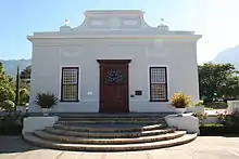 Built in 1967, the main building was originally a building called Saasveld House situated in Kloof Street, Cape Town. Saasveld House was the home of Dutch East India Company employee William Ferdinand van Reede van Oudtshoorn, the son of Baron Pieter van Reede van Oudtshoorn, built on land granted to his father in the 1740s.[2] The architect of Saasveld House was Louis Michel Thibault. It was demolished and rebuilt brick by brick in Franschhoek. The main building features original items from this building, e.g. door frame, slates from Robben Island, the gates to the premises. All were brought to Franschhoek by the Huguenot Society.