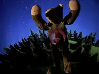 As Björk continues to sing, she appears walking in the forest, seemingly followed by the bear. A frame shows a nest full of Björk-like humans trapped in a pupa. When the bear and the singer meet, the animal makes the motion of roaring at her. She starts to fly through the forest, and during the flight she clings to a tree. The tree collapses, she falls down near the Hunter still lying supine on the ground, and she appears on the ground having the same dimensions of the hedgehog. Then, the situation of the opening frames is repeated, as Björk tries to cross the road and manages not to get hit by the car, driven by the Bear. In the following scenes, she sings in a river in the middle of the forest. While she contemplates the sky, the Moon appears to emanate pulsations, and the perspective shifts to what appears to be a moth. Now on the moon, the singer is shown dressed as an astronaut and plants a Soviet flag.