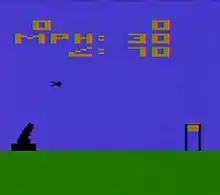 Human Cannonball is a non-military variant of an artillery video game released in 1979 by Atari, Inc. for the Atari VCS (later renamed the Atari 2600).[1] The goal is to launch a performer from a cannon so they land in container of water supported by a tower. The game was in the first wave of Atari VCS games after the original nine launch titles.[2] It was also among the first games for the console to be discontinued by Atari.[3]