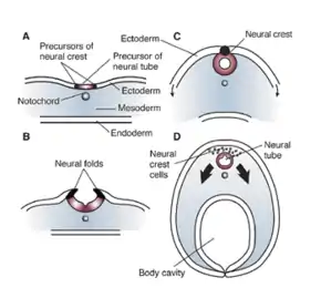 Neural crest cells (derived from the ectoderm) populate the lateral edges of the plate at the neural folds. In the fourth week—during the neurulation stage—the neural folds close to form the neural tube, bringing together the neural crest cells at the neural crest.[66] The neural crest runs the length of the tube with cranial neural crest cells at the cephalic end and caudal neural crest cells at the tail. Cells detach from the crest and migrate in a craniocaudal (head to tail) wave inside the tube.[66] Cells at the cephalic end give rise to the brain, and cells at the caudal end give rise to the spinal cord.[67]