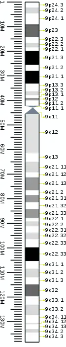 - "Search results - 9[CHR] AND "Homo sapiens"[Organism] AND ("genetype protein coding"[Properties] AND alive[prop]) - Gene". NCBI. 2017-05-19. Retrieved 2017-05-20.