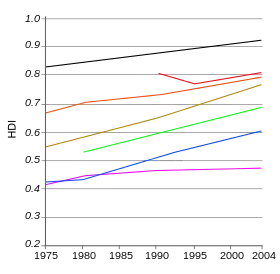 The Human Development Index (HDI) is the normalized measure of life expectancy, education and per capita income for countries worldwide. It is an improved standard means of measuring well-being, especially child welfare and thus human development.[17] Although this index makes an effort to simplify human development, it is much more complex than any index or set of indicators.[13]