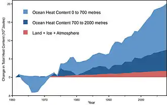 Most heat energy from global warming goes into the ocean, and not into the atmosphere or warming up the land.[48][49] Scientists realized over 30 years ago the ocean was a key fingerprint of human impact on climate change and "the best opportunity for major improvement in our understanding of climate sensitivity is probably monitoring of internal ocean temperature".[50]