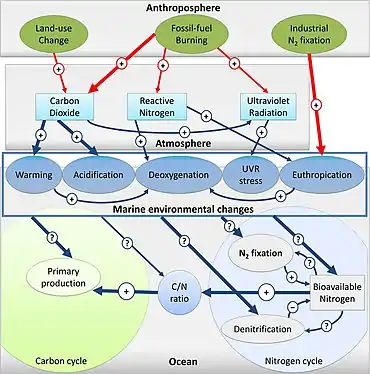 The diagram on the right shows some human impacts on the marine nitrogen cycle. Bioavailable nitrogen (Nb) is introduced into marine ecosystems by runoff or atmospheric deposition, causing eutrophication, the formation of dead zones and the expansion of the oxygen minimum zones (OMZs). The release of nitrogen oxides (N2O, NO) from anthropogenic activities and oxygen-depleted zones causes stratospheric ozone depletion leading to higher UVB exposition, which produces the damage of marine life, acid rain and ocean warming. Ocean warming causes water stratification, deoxygenation, and the formation of dead zones. Dead zones and OMZs are hotspots for anammox and denitrification, causing nitrogen loss (N2 and N2O). Elevated atmospheric carbon dioxide acidifies seawater, decreasing pH-dependent N-cycling processes such as nitrification, and enhancing N2 fixation.[105]