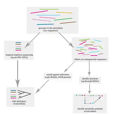 The problem of elucidating the human microbiome is essentially identifying the members of a microbial community, which includes bacteria, eukaryotes, and viruses.[12] This is done primarily using deoxyribonucleic acid (DNA)-based studies, though ribonucleic acid (RNA), protein and metabolite based studies are also performed.[12][13] DNA-based microbiome studies typically can be categorized as either targeted amplicon studies or, more recently, shotgun metagenomic studies. The former focuses on specific known marker genes and is primarily informative taxonomically, while the latter is an entire metagenomic approach which can also be used to study the functional potential of the community.[12] One of the challenges that is present in human microbiome studies, but not in other metagenomic studies, is to avoid including the host DNA in the study.[14]