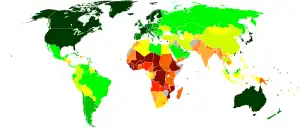 Coloured world map indicating Human Development Index (as of 2008). Countries coloured green exhibit high human development, those coloured yellow/orange exhibit medium human development, and those coloured red exhibit low human development.