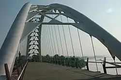 The bridge is constructed of two 1,200 millimetres (47 in) diameter high-strength steel pipes, bent into twin arches that rise 21.3 metres (70 ft) above grade, and suspend the deck by way of 44 stainless-steel hangers, each 50 millimetres (2.0 in) in diameter. The foundation consists of concrete-filled caissons which go down 30 metres (98 ft) below grade to the bedrock.[1]