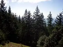 Humbug Mountain is one of the highest mountains in the U.S. state of Oregon to rise directly from the Pacific Ocean. It lies on the state's southern coast, about 6 miles (10 km) south of Port Orford and 21 miles (34 km) north of Gold Beach. The mountain is completely within Humbug Mountain State Park, and U.S. Route 101 passes by its northern base.[3][4][5][6] Its slopes feature an old-growth temperate rainforest.[7] Two trails run from the state park campground to the mountain's summit, one 1.5 miles (2.4 km) long, the other 2 miles (3.2 km) long. Both are part of the much longer Oregon Coast Trail.[3][4][5] The area is popular with hikers, campers, cyclists, and whale watchers although biking and camping on the mountain itself are prohibited.[3][7][8]