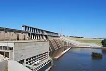 Hume Dam, formerly the Hume Weir, is a major dam across the Murray River downstream of its junction with the Mitta River in the Riverina region of New South Wales, Australia. The dam's purpose includes flood mitigation, hydro-power, irrigation, water supply and conservation. The impounded reservoir is called Lake Hume, formerly the Hume Reservoir. It is a gated concrete gravity dam with four earth embankments and twenty-nine vertical undershot gated concrete overflow spillways.