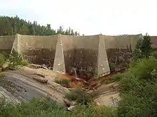 To create this reservoir, John S. Eastwood was hired in 1908 to construct a dam at Long Meadow.[2] Eastwood proposed constructing the world's first reinforced concrete multiple arch dam. Although unprecedented, at a cost of approximately $46,000, the dam's design was a less expensive alternative to a conventional rock fill dam that would have cost about twice as much to construct. The dam was completed in only 114 days, by the end of 1909, along with a mill immediately adjacent to the dam.[3] Logs were dumped into the reservoir by rail and floated to the dam where they were drawn up into the mill, cut and then dried in kilns next to the mill on the west bank of Tenmile Creek. From this location, lumber was floated to Sanger, California, in a flume filled with water from the reservoir. The flume was the longest ever created, eventually stretching 73 miles (117 km) from Hume Lake to Sanger.[4] Designed and built by James Carroll Goss, the flume was used by both the lumber company and tourists. Thrill seeking tourists would occasionally ride in the flume down from the Sierras in special boats designed with an open prow so that water would help keep the boats from flying off into the air. The flume was also reputedly utilized in 1893 by the bandit Chris Evans, of the Evans-Sontag Gang of Train Robbers, who hid along the flume to evade capture after escaping from the Fresno County Jail with his accomplice Ed Morrell.[5]