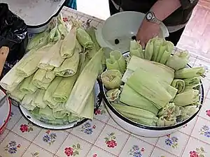 As in Ecuador, humitas in Chile are prepared with fresh corn, onion, basil, and butter or lard.[1] They are wrapped in corn husks and baked or boiled.[1] They may contain ají verde (green chili pepper). The humitas are kept together cooking with thread or twine.[1] They can be made savory, sweet, or sweet and sour, served with added sugar, chile pepper, salt, tomato, olive and paprika etc.[1] In Chile, humitas are traceable back to the 19th century.[2]