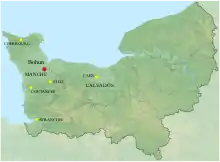 As is stated by Wace in the Roman de Rou, Humphrey derived from "Bohun" in Normandy: De Bohun le Vieil Onfrei ("from Bohun the old Humphrey").[2] Today this holding comprises two communes, Saint-André-de-Bohon and Saint-Georges-de-Bohon. He donated a plough and garden to the nuns of the Abbaye Saint-Amand at Rouen. The charter was witnessed by William, Duke of Normandy as Comes ("Count"), placing the gift before the 1066 Norman conquest of England. He later donated the church of Saint-Georges-de-Bohon to the Abbey of Marmoutier. After the conquest, he received lands in England including his seat at the manor of Tatterford in Norfolk, as recorded in the Domesday Book of 1086.