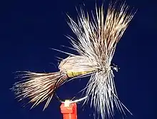 The Humpy style originated with an early 19th century fly called the Tom Thumb which was being tied in both the Eastern U.S. and Canada as well as England as late as the 1940s.[2] The Tom Thumb was a dry fly with two opposing clumps of deer hair over a colored thread body.