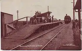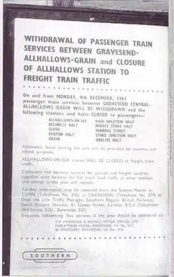 By 1906 it had become clear that Port Victoria would not develop into a major continental sea port and the South Eastern and Chatham Railway (SECR) began to look for new opportunities to bring in revenue. In July that year, seven wooden halts were constructed: Milton Road, Milton Range, Denton, Uralite, Beluncle, Middle Stoke and Grain Crossing.[2] Uralite halt was named after the nearby British Uralite Ltd complex which had opened in 1899 and manufactured drainage pipes from wet asbestos paste. On 1 May 1915, the little-used Milton Road Halt was closed.[3] The branch line to Allhallows-on-sea was opened on 16 May 1932,[4] followed on 17 July 1932 by opening of another halt at Stoke Junction.[5] A new station opened at Grain on 3 September 1951, replacing Grain Crossing Halt, which closed to rail traffic on 11 July 1951 and passengers on 3 September 1951 - a bus service being provided between those dates. The new Grain station was 300 metres (330 yd) west of Grain Crossing Halt.[6]