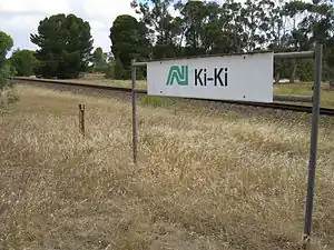 The town was proclaimed on 12 June 1913.[3] It got its name from the Kik Ki Well, which in turn was derived from the Aboriginal name for the worms dug out of the nearby soakage.[7] It has a small post office, parking bay, town hall, engineering business "Ki Ki Engineering", and is surrounded by large pastoral properties. At the 2006 census, Ki Ki had a population of 193.[8] Its postcode is 5261.