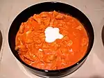 A chicken stew with much sweet paprika, cream or sour cream called tejföl. Known as chicken paprikash or by some translated variant in many Central and Eastern European countries. |