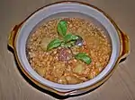 Egg barley with pieces of minced meat (usually pork), but sometimes potato and kolbász as well, along with various spices. |
