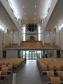 The church is rather unique in Norway because it is a part of a large building complex which includes a school, library, cafe, and leisure centre. The church cost about 84 million kr.