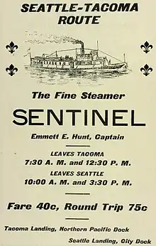 In 1902, the partnership ended, and Emmett Hunt took over the Crest on the Gig Harbor route. and appears to have continued in business until at least 1907 as the Hunt Steamboat Company. Arthur M. Hunt kept Sentinel and the sternwheeler Clara Brown.