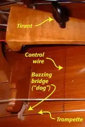 - Tirant: a small peg set in the instrument's tailpiece that is used to control the sensitivity of the buzzing bridge