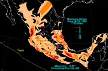 Two highway bridges and a railway bridge were damaged by flooding near the Guatemala border.[8] Passing very near Socorro Island on June 21, Adrian produced peak winds of 45 mph (72 km/h) there,[1] potentially damaging weather monitoring equipment.[10] Along the southern coastline of Chiapas, four people were swept away and drowned by a large wave, while farther inland in northwestern Durango, two men died and a five-year-old girl went missing after attempting to cross a river in a pick-up truck. Along the central coastline of Michoacán, a powerful hailstorm demolished many homes and left around 2,000 people homeless.[11] A 1.2 mi (2 km) stretch of coastal road was ruined in the city of Tecomán.[12] The outer bands of the hurricane produced heavy rainfall peaking at 15.75 in (400 mm) in the municipality of Coyutla;[13] minor flooding was reported across Coahuila and Colima.[1]
