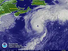 ![]() Hurricane Alex at peak intensity south of Nova Scotia early on August 5 | |