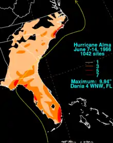 Hurricane Alma affected the entire state of Florida with strong winds and rainfall.[18] While the hurricane passed east of the Dry Tortugas, a station recorded winds of 125 mph (201 km/h), which were the highest winds on land. The station also recorded a pressure of 970 mbar (29 inHg), which was the lowest pressure recorded on land. Wind gusts reached 70 mph (110 km/h) in Key West,[1] causing a power outage. Rising tides flooded streets in the city,[10] including A1A which sustained damage to an adjacent seawall.[11] Damage in the lower Florida Keys was estimated at around $300,000. In southwestern Florida, the hurricane heavily damaged the mango crop.[1] High rainfall totals occurred across the state, peaking at 9.94 in (252 mm) in Dania Beach near Miami.[15] There were eight tornadoes or funnel clouds in the state,[1] including one in Dade County that damaged a home.[19] Along the west coast of Pinellas County, the storm damaged the grapefruit crop.[1] High winds, including a gust of 93 mph (150 km/h), caused power outages in the Tampa Bay Area. A wind gust knocked a car off of a bridge between Tampa and St. Petersburg, although the occupants were able to escape safely.[12] As it paralleled the coastline, Alma produced a storm tide of 10 ft (3.0 m) in New Port Richey. The high tides caused significant flooding in Cedar Key.[1] In northern Florida where Alma moved ashore, wind gusts reached 100 mph (160 km/h) in Crawfordville; the high winds damaged the local tobacco crop.[1] There were six deaths, of which two were electrocutions, two were drownings, and two were from heart attacks related to the storm.[1] One of the deaths was a man who had a heart attack while preparing to evacuate.[11] Damage throughout Florida was estimated at around $10 million. This was less than other storms of similar intensity, due to the sparse population of the affected area.[1]