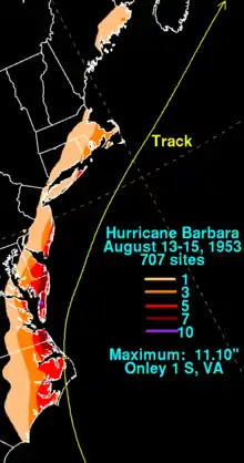 Hurricane Barbara was the second named tropical cyclone of the 1953 Atlantic hurricane season. Forming from a tropical wave on August 11 in the southern Bahamas, Barbara moved northward and attained hurricane status the next day. Ultimately peaking with winds corresponding to Category 1 status on the modern-day Saffir–Simpson hurricane scale, Barbara moved ashore in eastern North Carolina and curved back out to sea. The storm passed to the southeast of the New England region and dissipated on August 16. Damage from the hurricane was fairly minor, totaling around $1.3 million (1953 USD, $13.2 million 2023 USD). Most of it occurred in North Carolina and Virginia from crop damage. The hurricane left several injuries, some traffic accidents, as well as seven fatalities in the eastern United States; at least two were due to electrocution from downed power lines. Offshore Atlantic Canada, a small boat sunk, killing its crew of two.