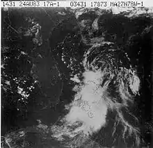 The origins of Hurricane Barry can be traced to a tropical wave which moved off the western coast of Africa on August 13, 1983. Strong wind shear in the North Atlantic hurricane basin prevented significant development of the system as it traveled towards the west-northwest. Little convection was associated with the disturbance as a result of the shear. While approaching the Bahamas on August 22, an upper-level trough moved away from the system, which led to a decrease in the wind shear.[1] The disturbance then entered this environment and spawned an area of low pressure which intensified. On August 23, the low had become sufficiently organized to be declared Tropical Depression Four. Later that day, the depression quickly strengthened into a tropical storm and was given the name Barry by the National Hurricane Center (NHC).[2][3] About 12 hours after becoming a tropical storm, Barry reached its initial peak intensity with winds of 60 mph (95 km/h).[4]