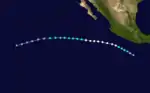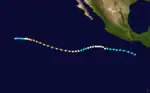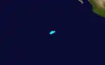 Part of the same tropical wave that formed Tropical Storm Danny in the Atlantic crossed over the Isthmus of Panama and became a disturbance in the Intertropical Convergence Zone during mid to late September. On September 20 the cloud pattern had increased in organization and the system was designated a tropical depression.[35] Continuing to strengthen, the depression became a tropical storm on September 21. The tropical storm then headed towards the northwest. Development was rapid, especially after September 22 as a banding type eye was forming. Further rapid development took place by the following day and the maximum sustained winds increased to its peak of 130 mph (215 km/h) by the afternoon of September 23. Jimena maintained itself as a powerful hurricane for three days, moving west until September 26, when it turned toward the west-northwest. Jimena began to weaken on September 27. A northwestward movement commenced on September 29 in response to a large upper-level trough which developed in its northwest. It continued to weaken and on September 30 it regained tropical storm intensity before becoming downgraded to a depression. On October 2, Jimena dissipated as a tropical cyclone.[35] Hurricane Jimena caused no reported damage or casualties.[36]