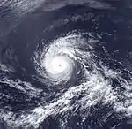 However, a well-defined eye reappeared on satellite imagery in the system and Kevin re-intensified to a low-end Category 3 hurricane with maximum winds of 115 mph (185 km/h) and a minimum pressure of 960 mbar (28 inHg) on October 7. But this was short-lived and on October 8 the hurricane began to weaken again and on October 9 it had entered into the Central Pacific basin as a waning Category 1 hurricane.[38] After this crossing, it was subsequently downgraded to storm strength the same day and on October 11, to a depression. It dissipated as a tropical cyclone that same day. The remnant circulation did persist a while longer as it slowly drifted north to finally lose its identity late on October 14.[20] Despite its long life, Hurricane Kevin caused no damage or casualties.[38] Because Kevin passed north of Hawaii, its only effect on land was increased trade winds.[20]