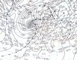 After maintaining a nearly steady course for three days, Hurricane Debbie turned northward and slowed as it neared a break in the ridge previously steering it west-northwestward.[7] During the evening of September 11, a United States Navy Aircraft reconnaissance mission into the storm estimated sustained winds of 110–120 mph (180–190 km/h) and a central pressure of 976 mbar (976 hPa; 28.8 inHg);[6] based on these data, reanalysis in 2019 concluded that Debbie peaked as a modern-day Category 1 hurricane on the Saffir–Simpson hurricane scale with winds of 90 mph (140 km/h). After maintaining its winds for over 18 hours, the system weakened and turned sharply towards the east-northeast in response to the upper-level westerlies.[6][8] By the afternoon of September 13, Debbie quickly accelerated towards the Azores. Early on September 15, the storm acquired extratropical characteristics and passed over the western Azores with winds estimated at 80 mph (130 km/h) before turning more northeasterly.[8] While the Weather Bureau's preliminary report noted that Debbie acquired characteristics of an extratropical cyclone on September 15,[6] until 2019 the system was still classified as a hurricane at that time and listed as such until its final position was noted.[3] Prior to reanalysis, the best track supplied by the Bureau and the National Hurricane Center's hurricane database maintained the system as a tropical cyclone until the afternoon of September 16, when the system was last observed.[8][9]