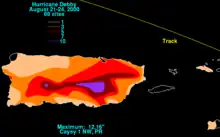 Debby also dropped up to 12 inches (300 mm) of rainfall across Puerto Rico in less than 48 hours, causing mudslides and damage to bridges and roads;[19] however, most of the island territory only received 3 inches (76 mm) of precipitation. The maximum rainfall on the island was 12.63 inches (321 mm) in Río Piedras, Puerto Rico. Additionally, 12.16 inches (309 mm) of precipitation was recorded near Cayey, though there were unofficial reports of 17 inches (430 mm) in the interior mountains of the region.[18] The hurricane dropped around 5 inches (130 mm) of rain in San Juan, producing slick roads that resulted in several minor car accidents.[18] There were 406 homes affected from the flooding, 5 of which were moderately to severely damaged. Losses in Puerto Rico reached $501,000, primarily in the Caguas municipality.[17][19] The storm was also indirectly responsible for the death of a 78-year-old man who fell while trying to remove a satellite dish from the roof of his home.[2][18][27]