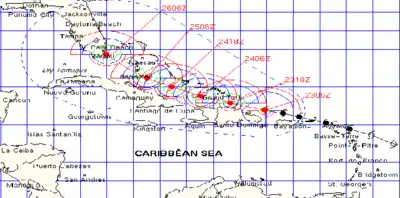 In addition, many tropical cyclone warnings and watches were posted in the Greater and Lesser Antilles. At 2100 UTC on August 20, a hurricane watch was issued for Sint Maarten, Saba, and Sint Eustatius, while there was a tropical storm watch for Antigua, Barbuda, and Anguilla. Early on August 21, the hurricane watch was expanded to include the United States Virgin Islands and Puerto Rico. Additionally, the tropical storm watch was extended out to the British Virgin Islands, Guadeloupe, Montserrat, Saint Barthélemy, Saint Kitts and Nevis, and Saint Martin. A hurricane warning was issued for Guadeloupe, Puerto Rico, and the Virgin Islands late on August 21. In Dominica, both a tropical storm warning and a hurricane watch were reported, while a tropical storm watch was put into effect in Dominican Republic. At 0300 UTC on August 22, a hurricane watch was issued for Haiti north of Port-au-Prince as was a tropical storm warning in Dominican Republic from Palenque to Cabrera. An hour later, a tropical storm watch was put into effect for the southeastern Bahamas and Turks and Caicos Islands. By 0900 UTC on August 22, Dominican Republic's entire north coast was under a hurricane warning. Additionally, the tropical storm watch for the southeastern Bahamas and Turks and Caicos Islands was upgraded to a hurricane watch.[2]