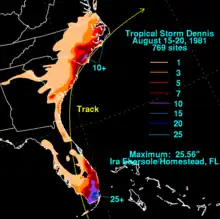 ![]() Hurricane Dennis near peak intensity off the coast of Maryland on August 20, 1981 | |