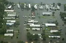 The Governor of Texas, Rick Perry, declared 14 counties in South Texas a disaster area.[33][58] Insured property damage estimates are near $525 million (2008 USD) with total property damage estimates (based on a 2–1 ratio of total damage to insured damage) near $1.3 billion (2008 USD)[59] in the state (with a large proportion of the losses being agricultural), and the Rio Grande cotton crop was expected to be a complete loss.[60] After weakening to a tropical storm, Dolly spun off another tornado near Poth early on July 24 with minor damage.[61] Near noon on July 24, an EF0 tornado touched down in the southern edge of downtown San Antonio near the Interstate 10–Interstate 37 interchange. Significant damage was reported in the area, with several commercial buildings losing their roofs and numerous houses damaged. Damage was also reported at the Windcrest Tower. About 1,500 customers lost power as a result.[62] Flash flooding from the remnant low of Dolly occurred in El Paso, Texas, on July 26:[63] one person was killed in an adjacent portion of New Mexico from a weather-related traffic accident.[64] Additional flash flooding and river flooding on the Rio Ruidoso in the Sacramento Mountains of New Mexico occurred on the morning of July 27, after more than 6 in (150 mm) of rainfall from Dolly's remnants: hundreds of tourists, campers and residents were evacuated[65] and the storm caused damage at the Ruidoso Downs racetrack.[66] One person was killed in the Rio Ruidoso flooding,[67] approximately 900 persons required rescue, approximately 500 structures were damaged, and initial damage estimates for Ruidoso, New Mexico were in the range of $15–20 million.[68]