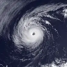 Later on August 11, the NHC predicted relatively slow weakening beginning in about 24 hours, as the storm would cross over slightly colder sea surface temperatures in the wake of Hurricane Eugene.[8] However, at 00:00 UTC on August 12, Dora attained its peak intensity with maximum sustained winds of 140 mph (220 km/h) and a minimum barometric pressure of 943 mbar (27.8 inHg).[2] At the time of peak intensity, the hurricane featured a 17 mi (27 km) diameter eye, surrounded by cloud tops with temperatures of −85 to −94 °F (−65 to −70 °C).[9] Six hours later, Dora weakened slightly due to an eyewall replacement cycle, but re-attained peak intensity by 12:00 UTC.[2] The cyclone again fell below peak intensity at 12:00 UTC on August 13 due to cooler waters and increasing wind shear.[2][10] Dora weakened to a Category 3 about six hours later,[2] as the eye became cloud-filled and surrounding cloud tops warmed.[11]